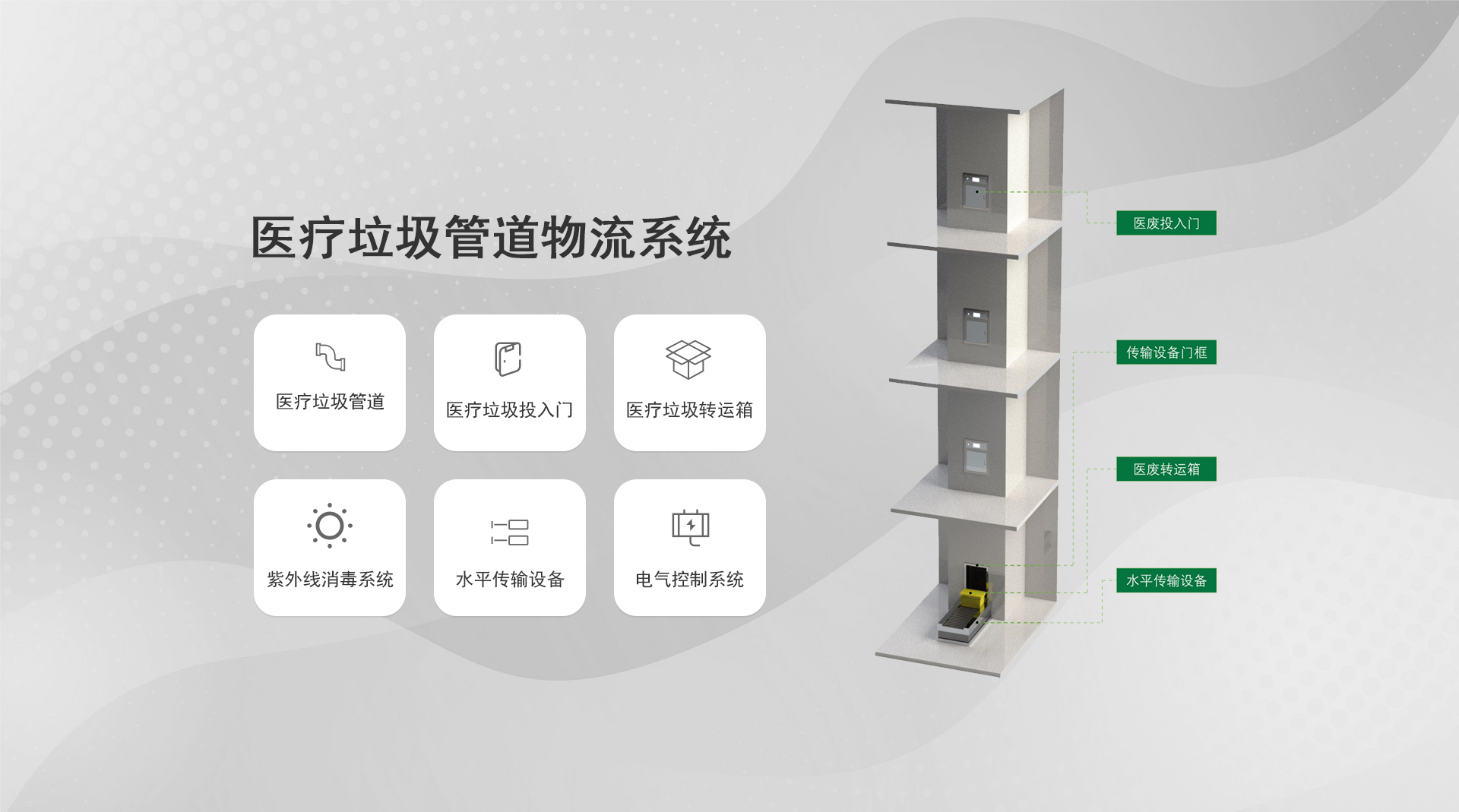 系統(tǒng)簡介:通過氣力式輸送管道對(duì)醫(yī)院內(nèi)的垃圾和污衣被服進(jìn)行收集,是一種對(duì)垃圾實(shí)行全封閉、壓縮化、集裝化收運(yùn)的現(xiàn)代垃圾運(yùn)輸及匯集方式...